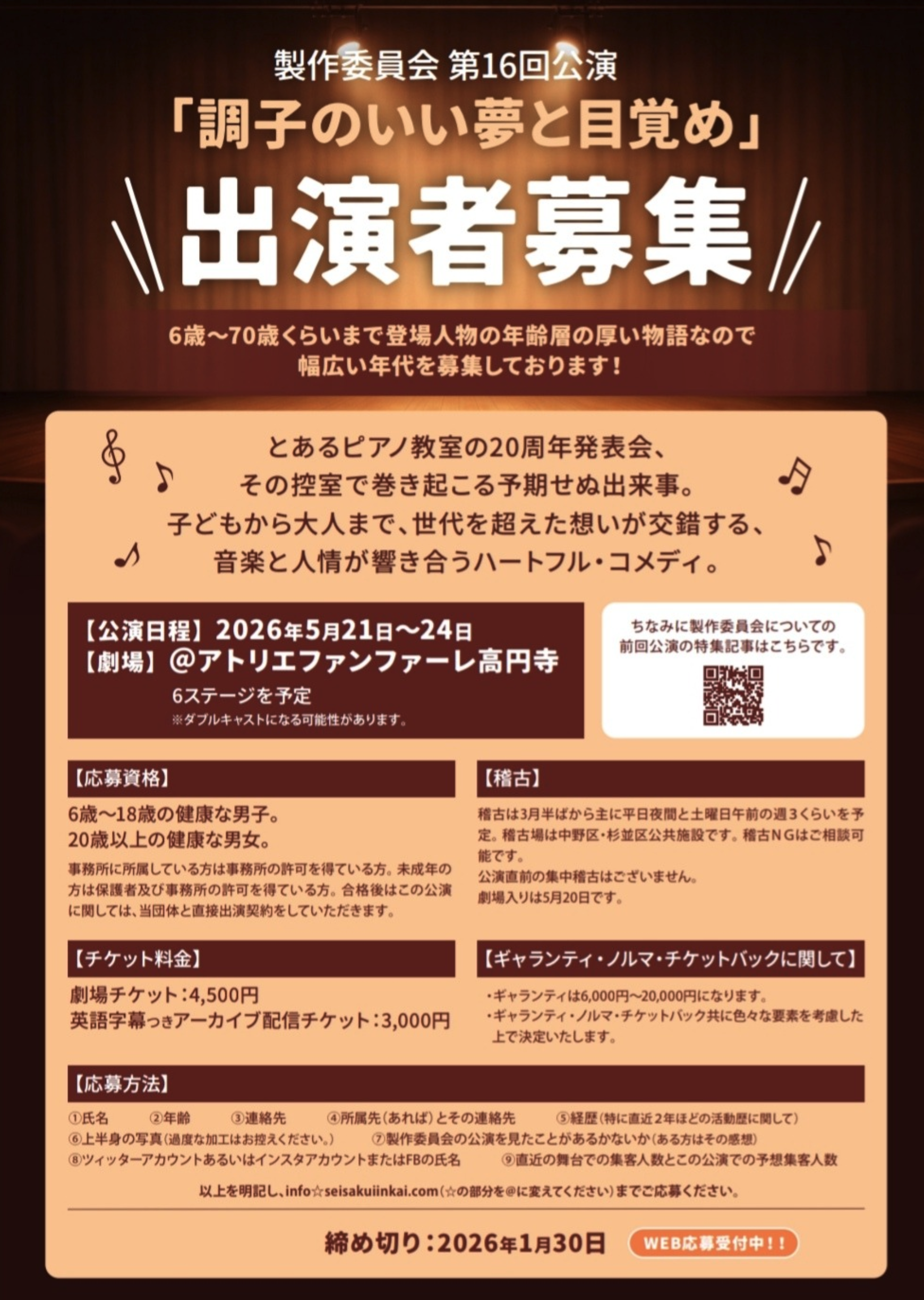 2026年5月21日(水)〜5月24日(土)に東京都・アトリエファンファーレ高円寺にて製作委員会第16回公演「調子のいい夢と目覚め」の上演が決定しました。